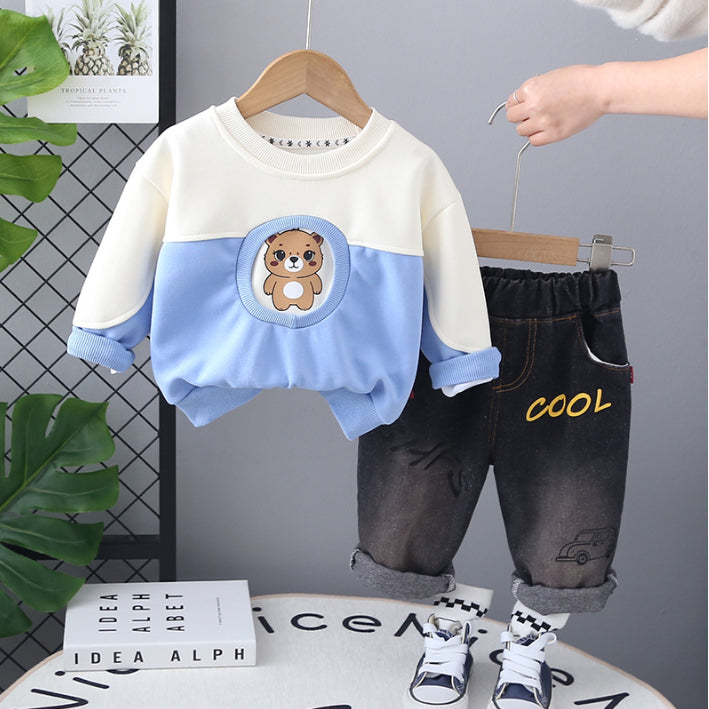 A comfy 2-piece set with a soft bear print sweatshirt and trendy jeans. Available in blue or green, perfect for playful everyday wear from ages 1 to 5.