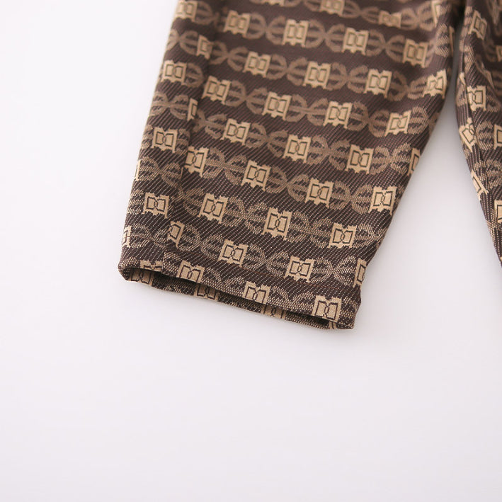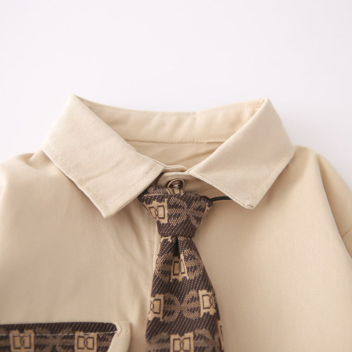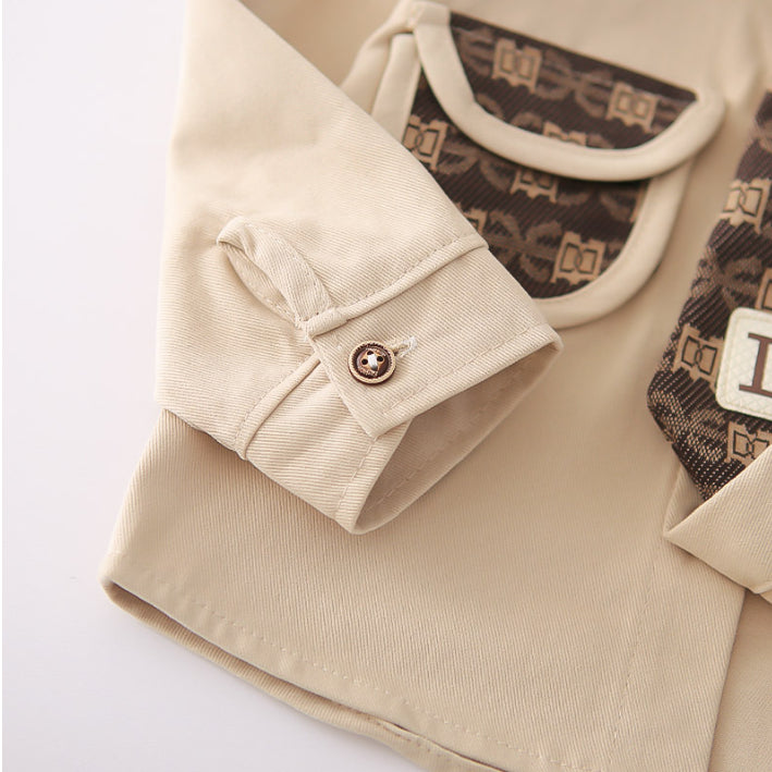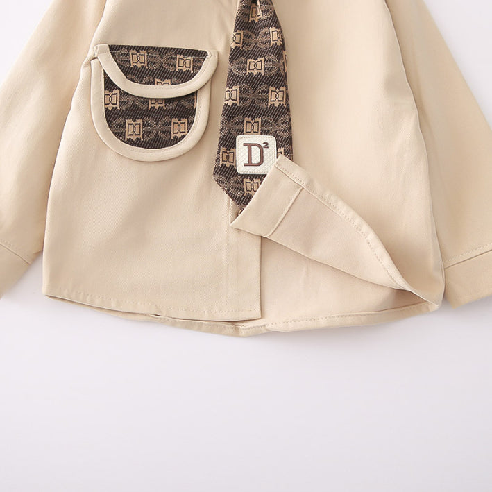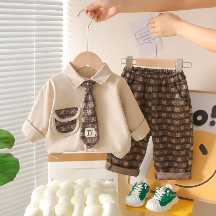 A sleek 2-piece set for little gentlemen, featuring a collared shirt with patterned pocket detail and matching pants. Available in black or beige pants, perfect for both casual chic and special occasions.
