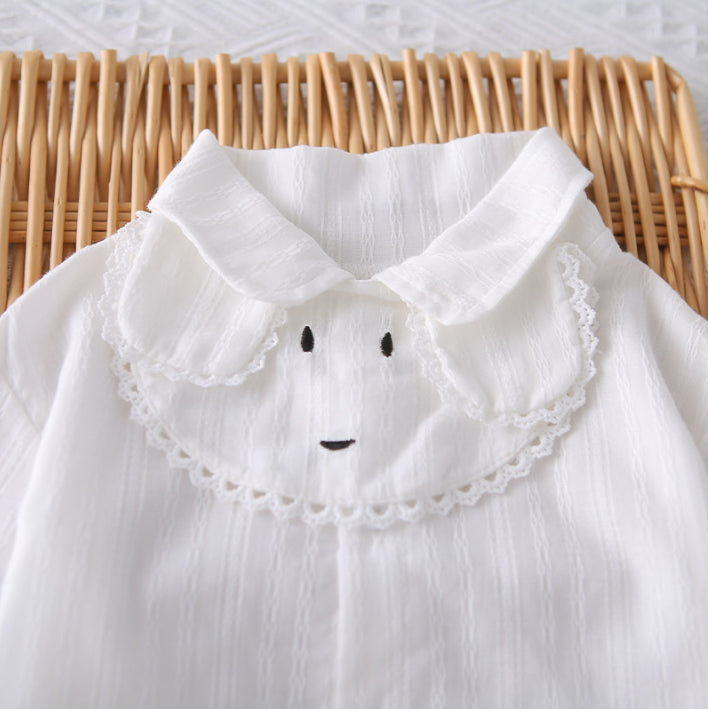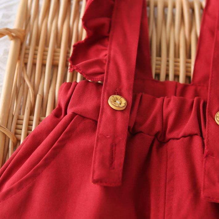 A classy 2-piece suspender set featuring a ruffle-collar shirt and matching high-waist suspender pants. Available in red, pink, or blue, perfect for both casual and special occasions.