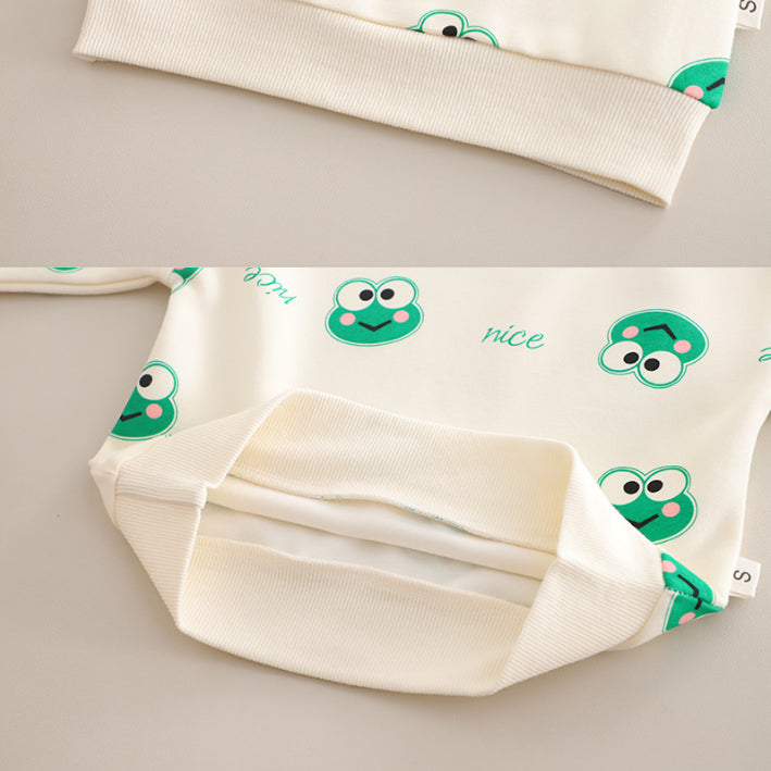 A playful 2-piece unisex set featuring a soft printed top with cute frog patterns and matching overalls with 3D frog details. Available in green or brown, perfect for active little ones.