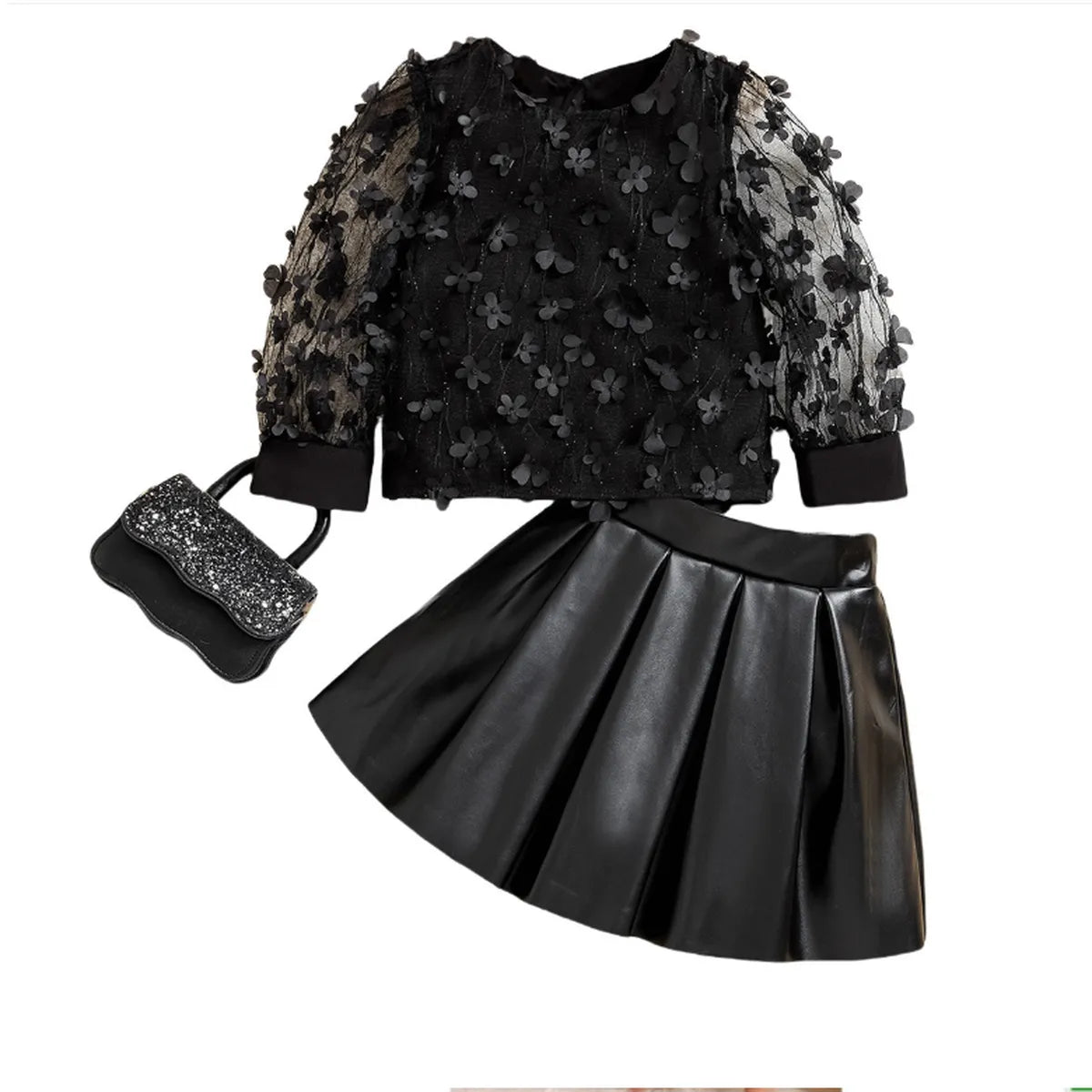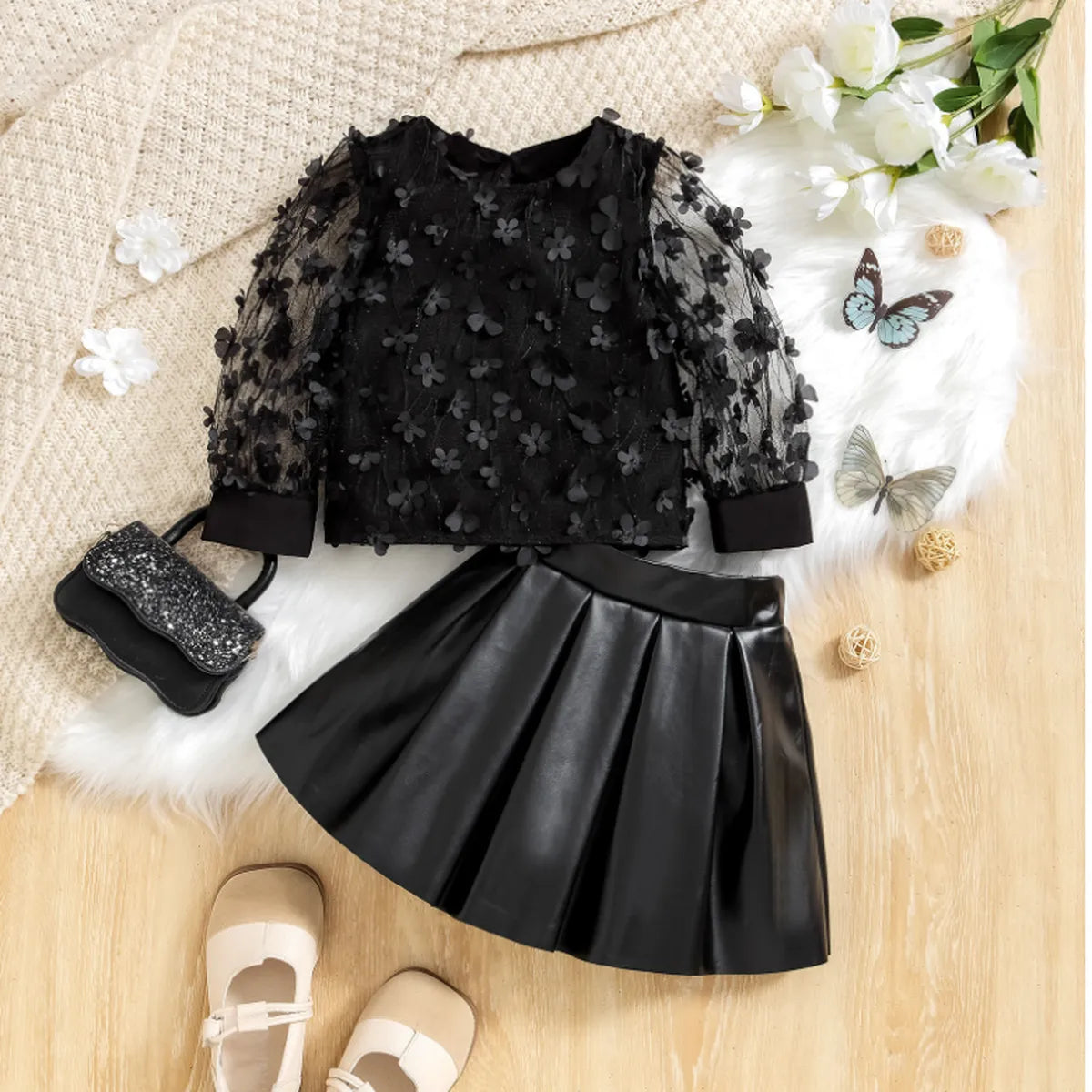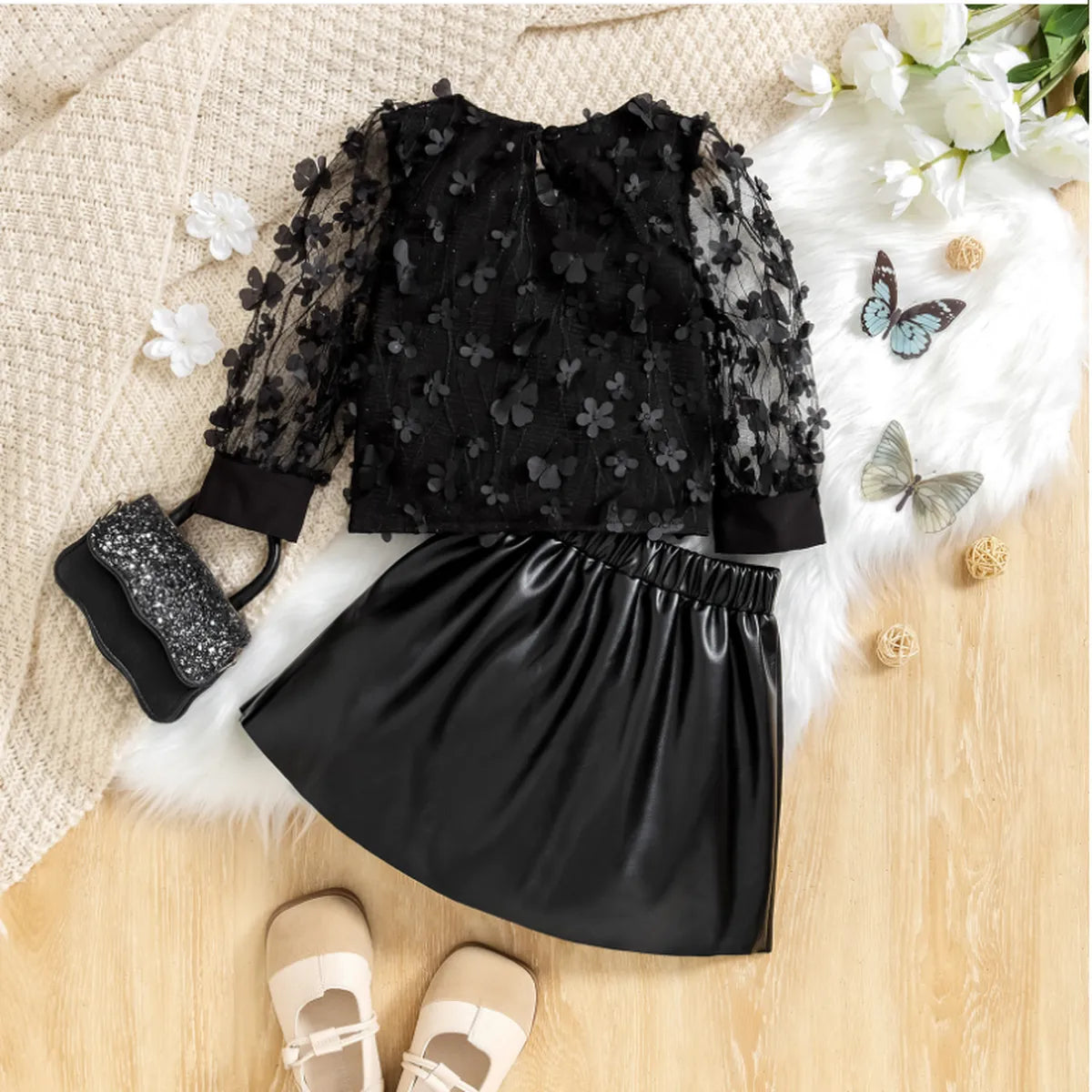 3D Floral Mesh Top & Faux Leather Skirt Set – All Black Elegance (1-7 Years)