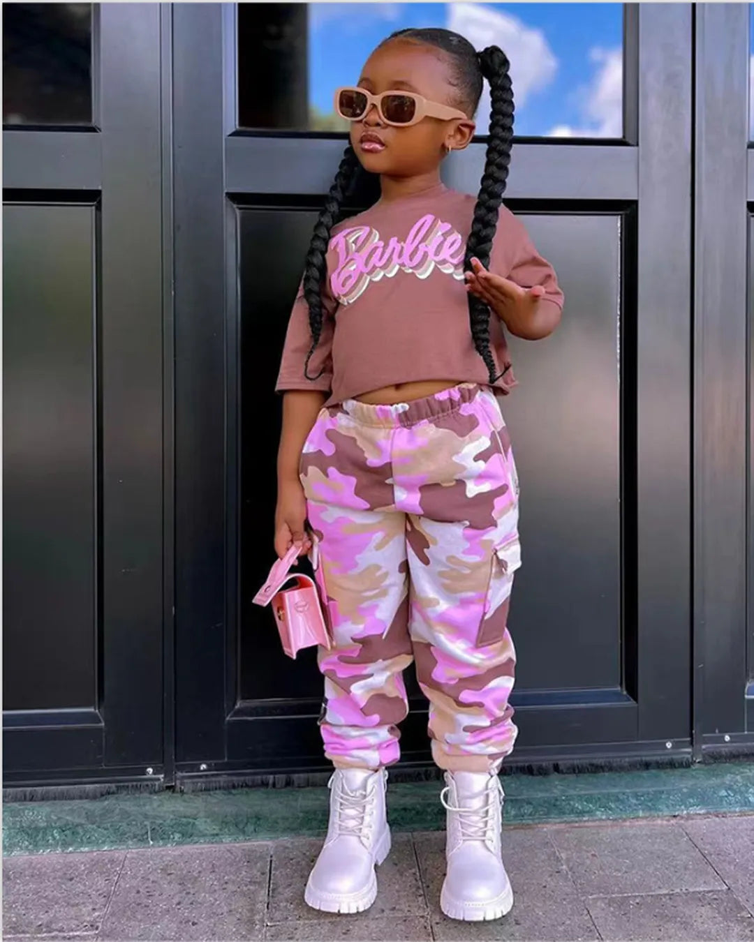 Barbie Crop Top & Pink Camo Pants Set – Girls 2–7Y