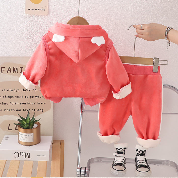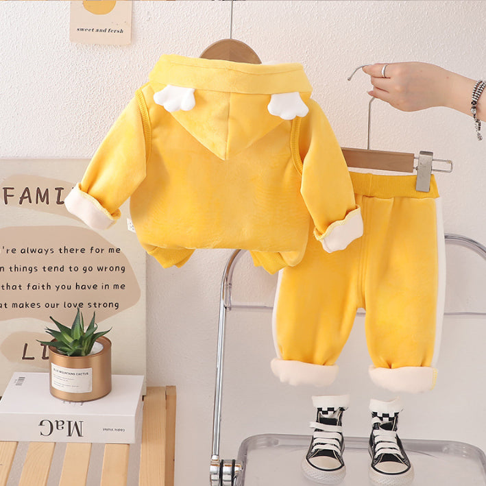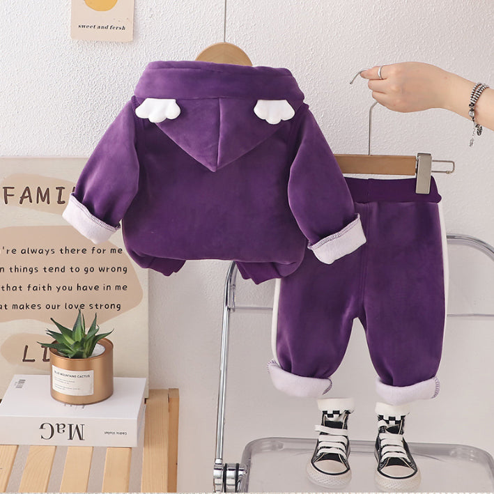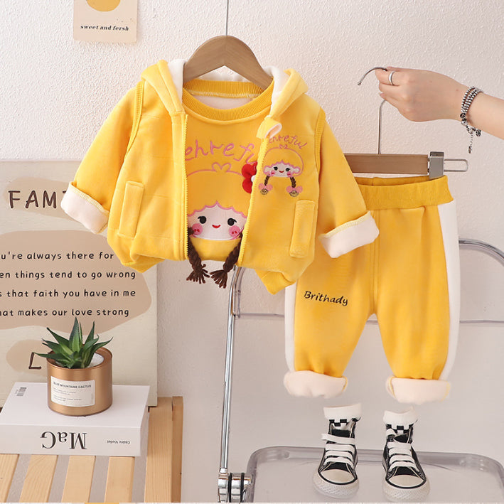 A colorful 3-piece girls’ set including a warm hoodie, fun printed sweatshirt, and comfy pants. Available in yellow, pink, or purple, perfect for daily wear through the fall and winter seasons.