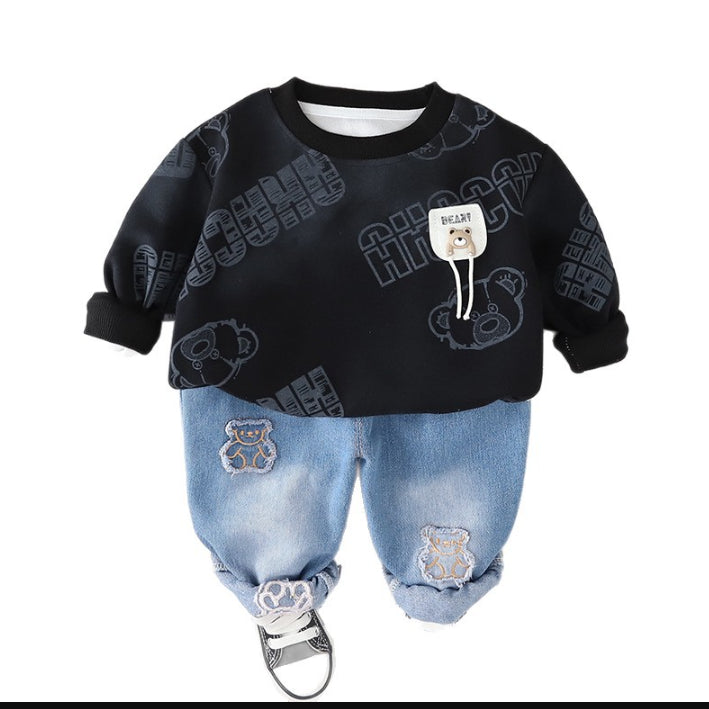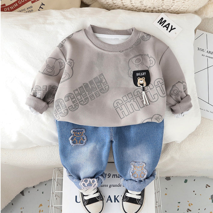 A modern 2-piece set combining a bear-detailed sweatshirt with comfy denim jeans. Available in black, beige, and grey — perfect for stylish everyday wear.