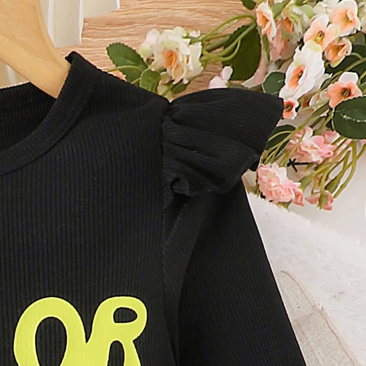 Bold attitude meets playful style in this 2-piece set. The black long sleeve top features a neon graffiti-style slogan, perfectly paired with an asymmetrical buttoned denim skirt for a confident street look.