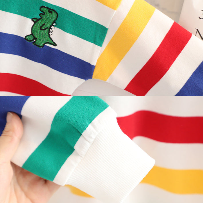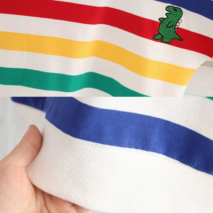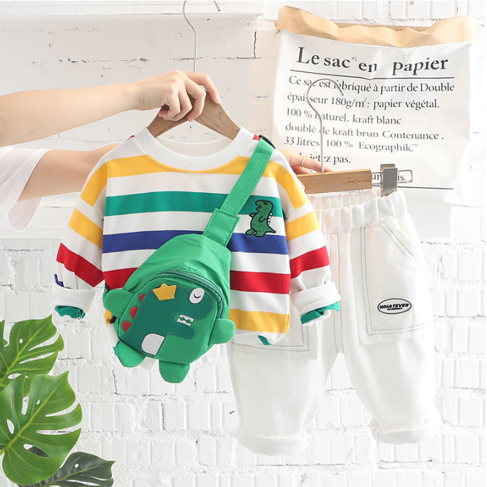 A colorful 2-piece outfit featuring a rainbow stripe top and comfy white pants, completed with a playful dinosaur crossbody bag as a gift. A cheerful choice for fun days out.